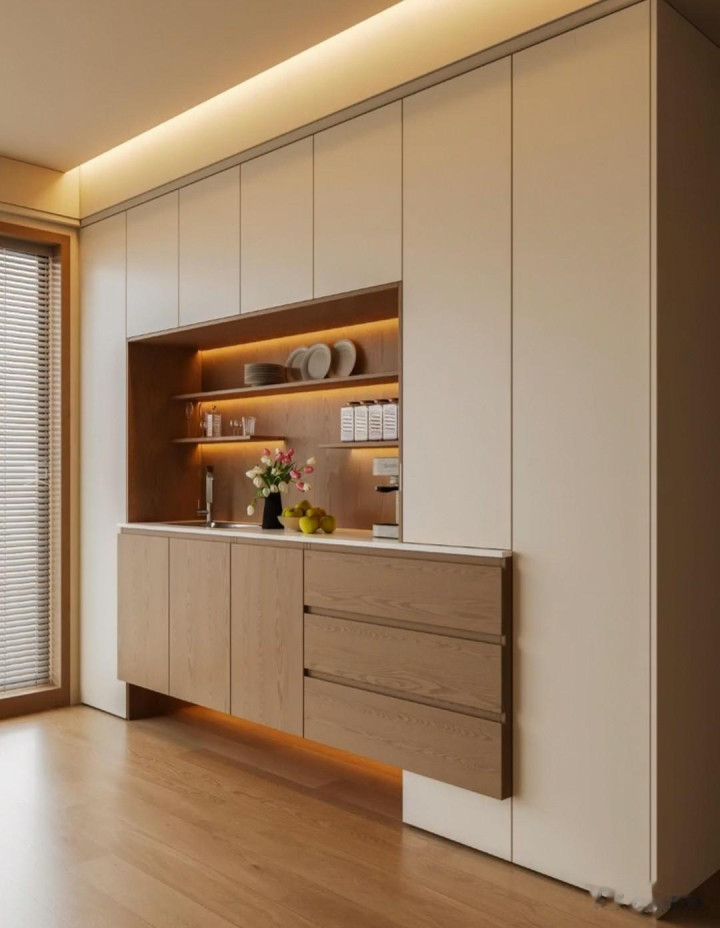 圆滑的内弧设计是它的亮点,肤感白与胡桃色搭配真可谓美妙绝伦,下圆式门洞造型,如行云流水一样的婉转流畅,暖光灯带晕染了氛围,彰显了柜体的风度。很棒![比心][比心][比心][比心][加油][加油][加油]