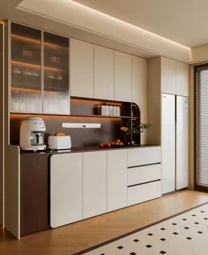 这款餐边柜运用了进退设计手法,再将局部柜角设计成圆形,整体画面婉转流畅,奶白浅胡桃色搭配让餐边柜得到了升华。竖帘纹玻璃门凸出靓点。冰箱与柜体合而为一,设计的比例协调,搭配得当,这种新款,我敢说,你绝对第一次见它,喜欢它?搬回家。[爱慕][爱慕][微笑]