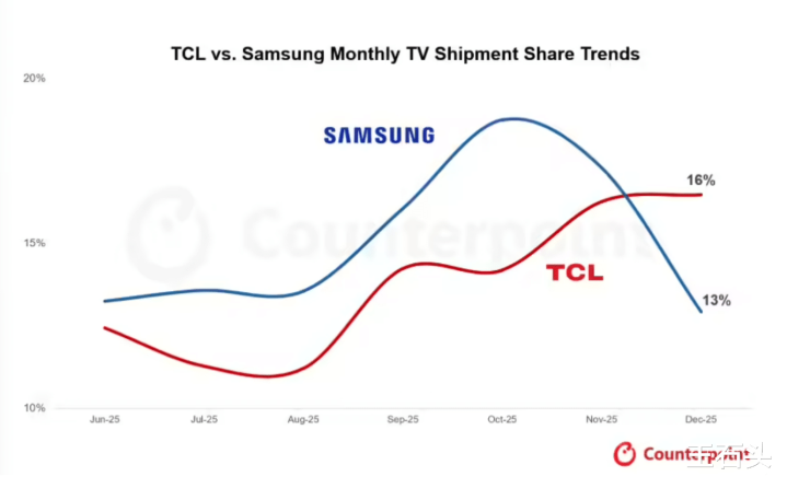 但这次是真的,根据调研机构Counterpoint Research最新的市场报告显示,2025年12月,TCL终于把那个曾经遥不可及的三星拉下了马,首次登顶全球电视出货量月度榜首!